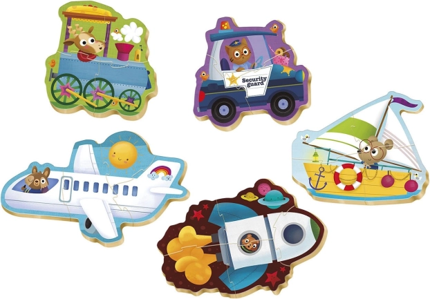 Det spanske mærke EDUCA præsenterer specialdesignede puslespil til børn fra 24 måneder: et sæt med fem progressive puslespil med motiv af dyr i transportmidler.