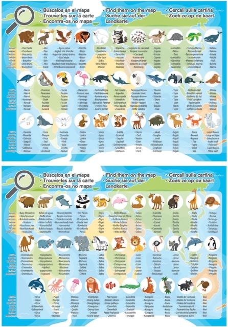 Geografisk puslespil for børn med illustrationer af dyr fra hele verden. På puslespillet finder du blandt andet pingviner, kameler og bisonokser. Navne på kontinenter og have er på engelsk. Pakken indeholder også en informationsfolder med navne på alle dyr (spansk, fransk, portugisisk, engelsk, tysk, italiensk, nederlandsk). Når puslespillet er samlet, kan I lege en billedjagt. Hvem finder dem alle? Mål på det samlede puslespil ca. 48 × 34 cm