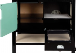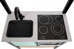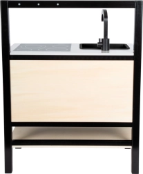 Skabet under bordpladen, kroge til ophæng af redskaber og en hylde med bund, der kan bruges som rist, holder orden. Den venstre del af skabet kan bruges som “køleskab” eller “opvaskemaskine”.