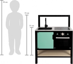 Det moderne træ-legekøkken i industriel stil SMALL FOOT begejstrer med realistiske detaljer og smart opbevaring. Takket være det industrielle design med sort ramme, realistiske funktioner (enkeltgrebsarmatur, aftagelig vask, ovn med bageplade, klikbare drejeknapper) og rigt tilbehør er det klar til leg med det samme. Ideelt til små kokke fra 3 år.