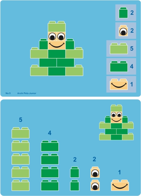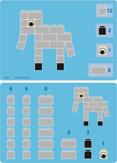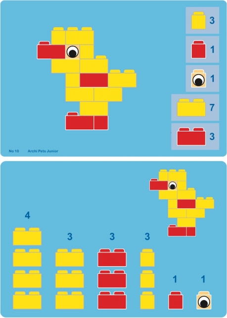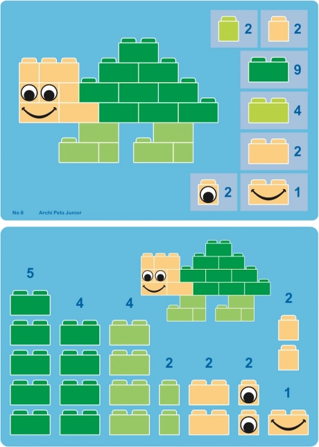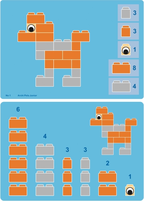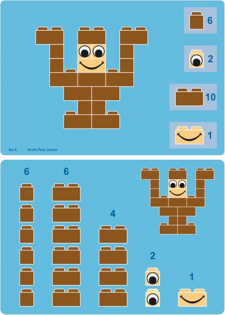 ArchiPets Junior er det ideelle valg til førskolebørn og skolebørn, der elsker dyr og at skabe. Med de tydelige vejledninger bygger børn let deres første modeller og kan derefter slippe fantasien løs og skabe egne former. Let sammenkobling af klodser giver succes selv for de yngste byggere og motiverer til videre udforskning.