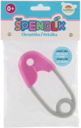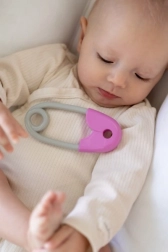 Ranglen i form af en sikkerhedsnål er en uundværlig del af enhver babys udstyr. Den er udformet, så den er nem at gribe for små hænder og belaster ikke med sin lave vægt. Dens rosa-grå kontrastfarver fanger opmærksomheden og støtter det visuelle input. Børn vil elske den blide raslen, som følger med hver bevægelse.