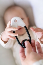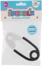 Ranglen formet som en sikkerhedsnål er designet til at støtte finmotorik og sensoriske oplevelser hos børn fra fødslen. Takket være sit kontrastfyldte design tiltrækker det barnets opmærksomhed, mens de små kugler indeni giver en blid raslende lyd.