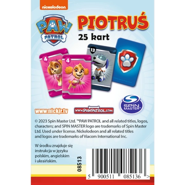 Kortspillet Piotruś med PAW PATROL-motiv fra Trefl bringer et hurtigt og sjovt spil for børn fra 4 år. Enkle regler, elskede figurer og udvikling af opmærksomhed og koncentration gør dette spil til et godt valg til familiehygge og rejser.
