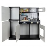 Stilfuldt XL trælegekøkken fra KRUZZEL i sort, hvid og guld giver børn realistisk madlavningsleg. Det byder på LED-belysning, lydeffekter fra kogepladerne, bevægelige elementer og masser af tilbehør inkluderet (gryde, pande, låg, 4 skeer). Aftagelig vask, ovn, mikroovn og opbevaringsskabe med “klik” stimulerer kreativitet, læring gennem leg og rolleleg.