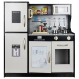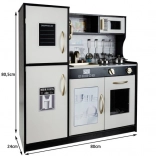 XL legekøkken i træ (MDF) imponerer med detaljer og holdbarhed. LED-lampen kan placeres under skabet, i skabet eller i ovnen, så børn kan nyde en ægte madlavningsstemning selv i dæmpet lys. De drejelige knapper på komfuret giver realistiske “klik”-lyde, som gør legen endnu mere medrivende.