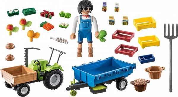 Landmandsfigur, trailer, kasser, frugt, grøntsager og værktøj udvider lege-mulighederne og styrker finmotorikken.