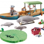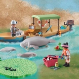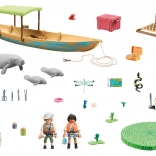 Der medfølger en båd med påhængsmotor, redningskrans, værktøj og kamera, to forskerfigurer, en voksen manate og to unger samt vandplanter. Et QR-kort åbner for læringsindhold til sjov viden om dyrene og deres levesteder.