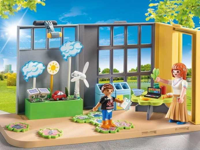 Der medfølger beholdere til affaldssortering, planter, økologiske dekorationer, elementer af “grøn” infrastruktur og skoleudstyr. Sættet er kompatibelt med andre PLAYMOBIL-byggesæt (fx udvidelser til klasseværelser), så det nemt kan integreres i en større skoleverden.