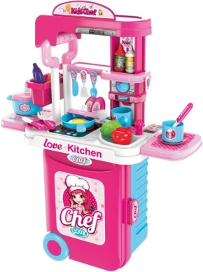 Vi præsenterer Børnekøkkensæt 3-i-1, som kommer i en kompakt kuffert, ideel til små kokke. Dette sæt kan nemt omdannes til et bord- eller klassisk køkkensæt: