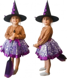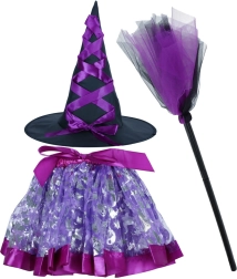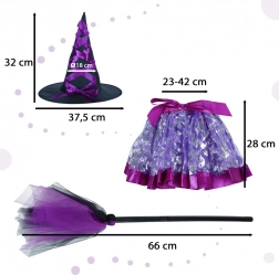 Fantastisk heksekostume til børn tilbyder et komplet outfit med tre accessories: sort og lilla hat, lilla nederdel og en magisk kost. Ideelt til Halloween og temafester.