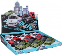 Der findes 4 designvarianter – brandvæsen, militær, politi SWAT og hvid politibil – ideelle til samlingen eller som gave. Modellen har kompakte mål 13 × 6 × 6 cm og skyder let frem efter et skub takket være friktionsmotoren.
