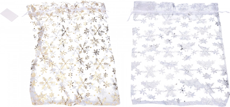 Elegant julepose af organza med snefnug design er perfekt til indpakning af gaver. Fås i guld og sølv farve.