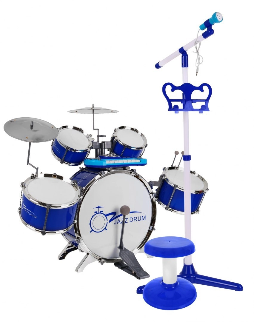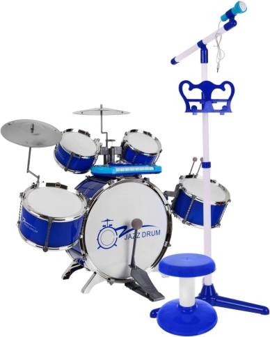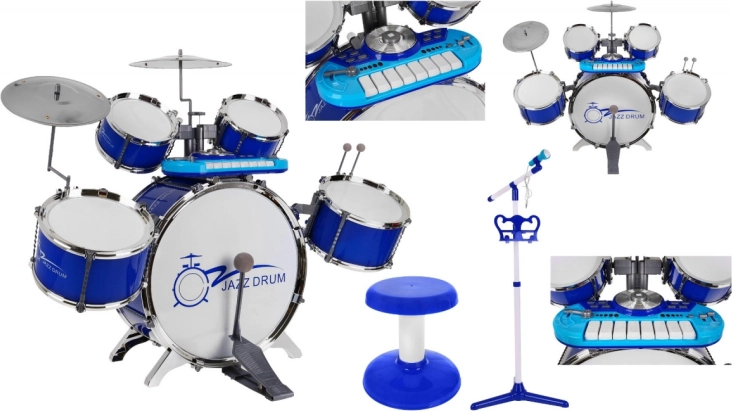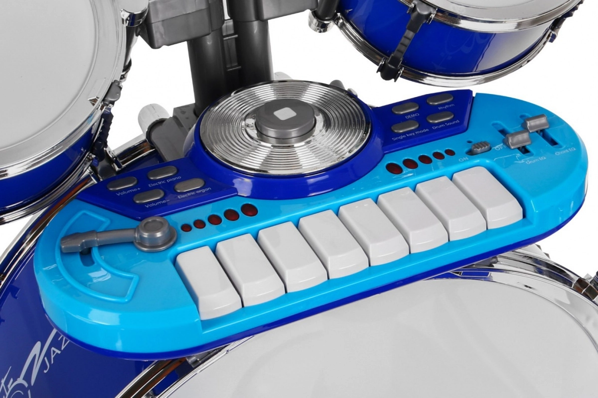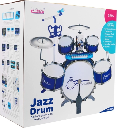 Dette veludstyrede musiksæt giver børn en komplet oplevelse: trommer med pedal, flere trommer og bækkener, et kompakt keyboard med DJ-arm og mix samt mikrofon på et stabilt stativ. Keyboardet tilbyder 8 tangenter, 8 rytmer, 8 demo-baggrunde, valg af lyd piano/orgel, 10 blinkende lys, lydstyrkekontrol og automatisk slukning efter 3 minutter. Trommerne lyder realistisk, og trommestikkerne med blødt skum beskytter overfladen og hørelsen.