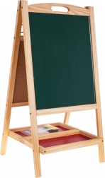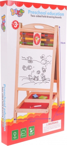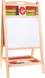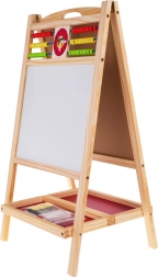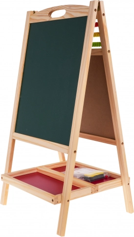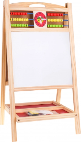 Dobbeltsidet trætavle med kugleramme er et fremragende pædagogisk legetøj til børn fra 3 år. Denne multifunktionelle tavle har en hvid magnetisk side og en kridtside. På den hvide side kan du skrive med en tusch, som medfølger i pakken. Tuschpennen er magnetisk og har en viskelæderspids. I den øverste del af tavlen er der placeret en kugleramme og et ur med bevægelige visere. På kridtsiden kan der tegnes med kridt, som er inkluderet, og derefter kan alt viskes ud med svampen.