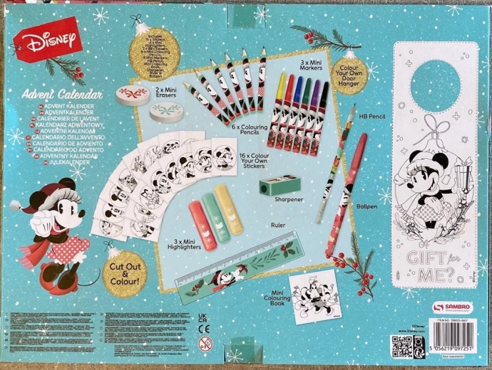 Adventskalender DISNEY MINNIE med 24 kreative overraskelser: farveblyanter, tuscher, klistermærker, notesblok, stempel og overstregningstuscher. Den perfekte gave til førjulstiden.