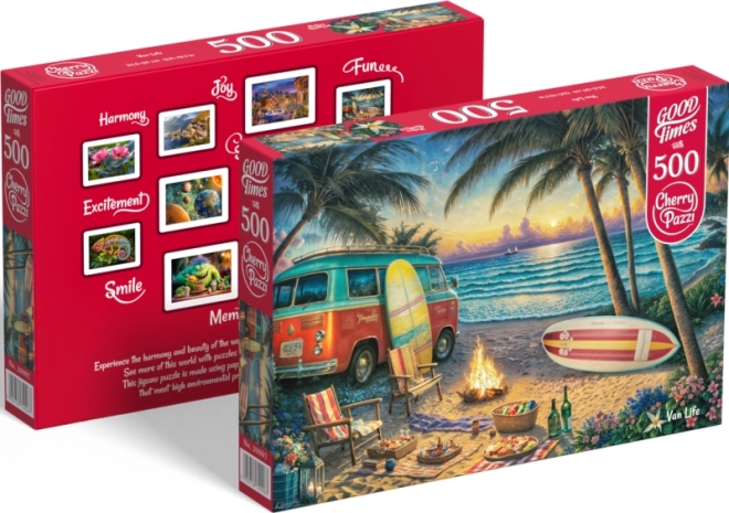 Puslespil "Livet i en campingvogn" tilbyder afslappende underholdning med 500 brikker og et spændende motiv for alle, der elsker puslespil.