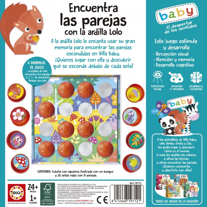 EDUCA Baby Find par med egernet Lolo er et pædagogisk spil, der hjælper børn fra 24 måneder med at udvikle deres hukommelse, motorik og kreativitet gennem søgning efter matchende billeder.