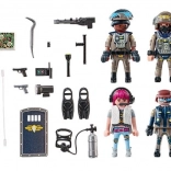 - 37-delt sæt med politifigurer, inklusive fire PLAYMOBIL-figurer, tre fra Tactic-taskforcen og en kriminel, dykkerflaske, hjelm, GPS, koben og masser af specialudstyr til actionfyldte jagter på børneværelset.