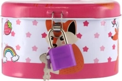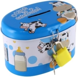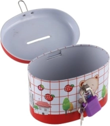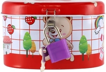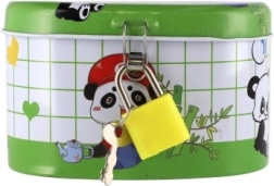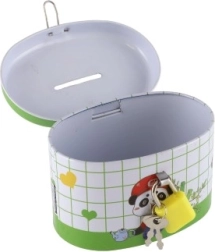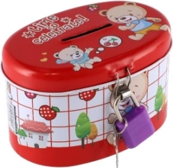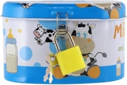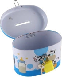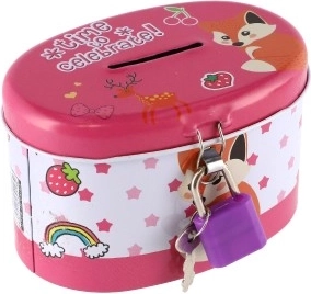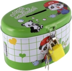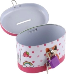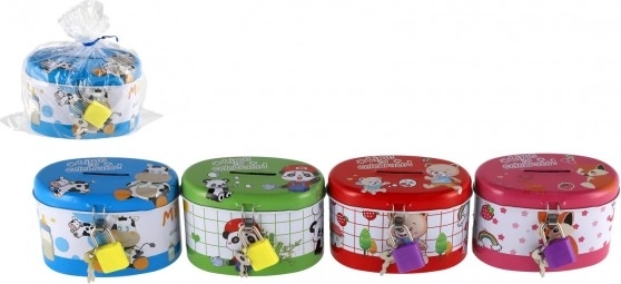 Den ideelle sparebøsse til børn, som kombinerer sikkerhed og sjov. Børnesparebøssen er lavet af holdbart metal og har en lille lås, der sikrer, at pengene forbliver i sikkerhed. Låget er pyntet med muntre illustrationer, der tiltaler enhver lille opsparer: