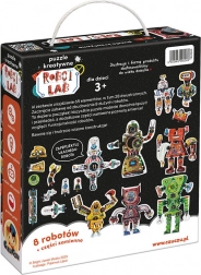 Det kreative puslespil Robot Lab tilbyder uendelige kombinationsmuligheder. Sættet består af 63 kvalitetsbrikker i glansfuldt, præcist udstanset karton, som passer perfekt sammen takket være smart formgivning og illustrationer. Børn samler først 8 store robotter og ændrer derefter deres udseende med “reserve”-dele – eller skaber helt nye figurer og maskiner.