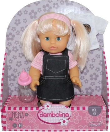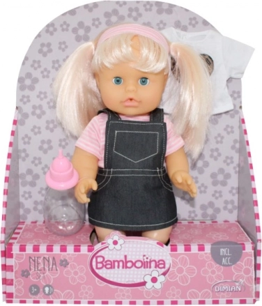 Dukken med blonde rottehaler ligger i en attraktiv lyserød æske fra Bambolina – klar til at glæde som gave.