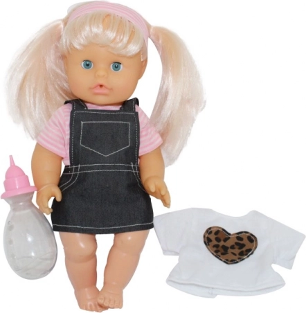 Dukken drikker fra flasken og tisser bagefter – ideelt til naturlig læring og efterligning af ægte babypleje.