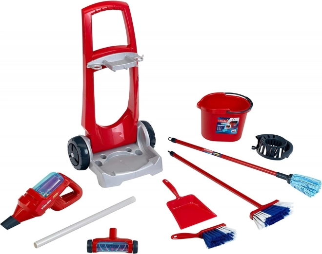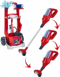 Vognen indeholder forskellige rengøringsredskaber som moppe, kost og støveklud, der giver børnene flere legemuligheder.