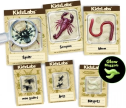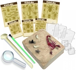 Gipsblokken gemmer realistiske figurer af edderkopper, orme og myrer. Børn afslører dem gradvist ved hjælp af det medfølgende mejsel og pensel.