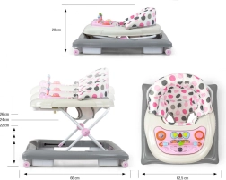 Produktet har et læringspanel, der indeholder en række overraskelser, som venter på små opdagelsesrejsende: lys, pivelyde, melodier, rangle, knapper og andre bevægelige elementer. Når panelet tages ud af gåstolens bakke, kan det bruges som et selvstændigt legetøj, f.eks. som rejseledsager, og den øverste del kan bruges som et aktivitetsbord.