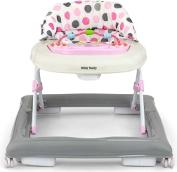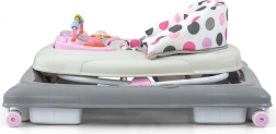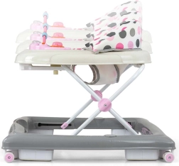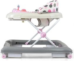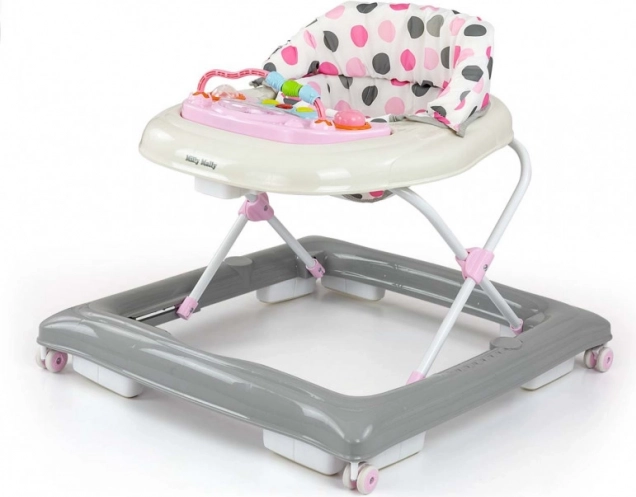 Fire kvalitets drejehjul, som ikke ridser overfladen, de bevæger sig på, sikrer fri bevægelighed, og otte gummistoppere beskytter barnet mod at glide ned ad trapper eller andre forhindringer.