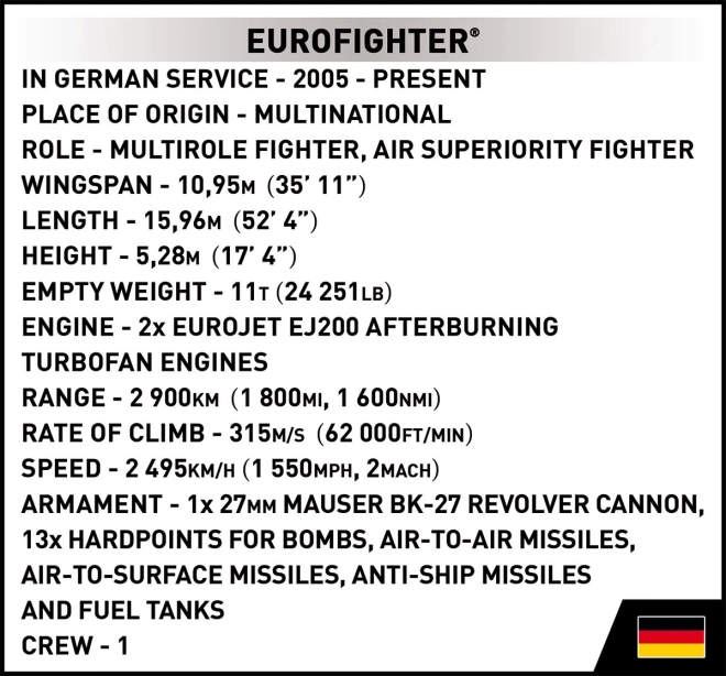 Byggesættet er fremstillet i EU og opfylder strenge sikkerhedsstandarder. Klodserne har holdbare tryk – ingen klistermærker – som tåler intensiv brug og temperaturer. Modellen fuldender din Armed Forces-samling og glæder enhver fan af moderne militærteknik og flymodeller.
