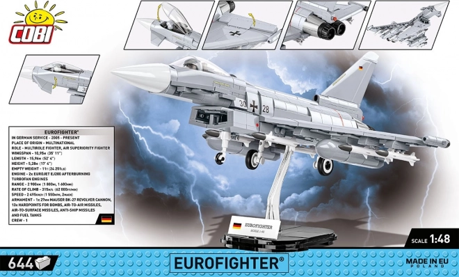 Byg den ikoniske EUROFIGHTER TYPHOON i 1:48-skala af 644 klodser fra COBI. Modellen byder på en åbnbar cockpit, bevægelige flader, aftageligt landingsstel og en stand med navneplade til effektfuld udstilling. Højkvalitets tryk falmer ikke og slides ikke af, og byggesættet er fuldt kompatibelt med andre mærker. Ideelt til flyentusiaster, militaria og samlere af Armed Forces-serien.