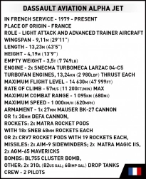 Alpha Jet er et let angrebs- og avanceret træningsfly, der opstod gennem tysk-franske samarbejde og kom i tjeneste i 1970'erne. Denne klodsmodel er skabt under licens fra den franske producent af militærfly Dassault Aviation og supplerer samlingen af Armed Forces-modeller i skala 1:48.