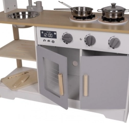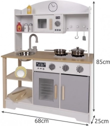 HOLDBARHED - køkkenet er lavet af kvalitets træ, hvilket stærkt påvirker dets brugslængde og sikkerhed og sundhed for de mindste. Det er et tidløst design, der vil glæde enhver lille. På grund af dets klassiske design er det altid blevet højt værdsat. Ekstraordinær omhyggelig udførelse sammen med æstetisk udformning og fokus på de mindste detaljer giver produktet ekstra værdi og er en fryd for øjet. Køkkenet kan også succesfuldt udfylde en dekorativ funktion og være en pryd for børneværelset.