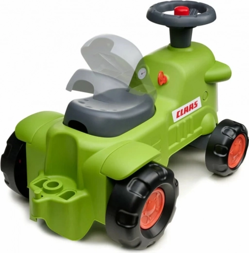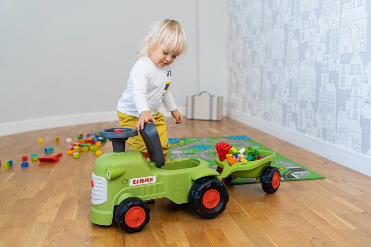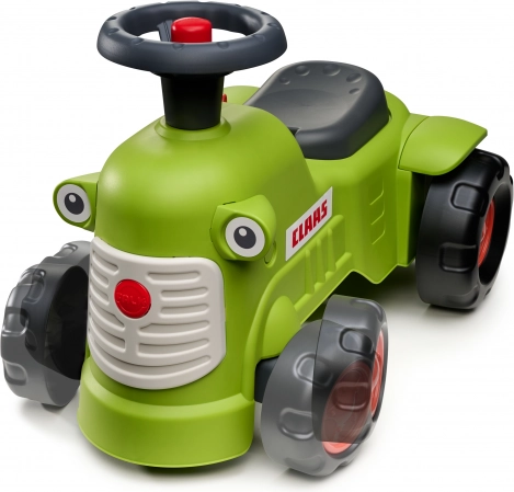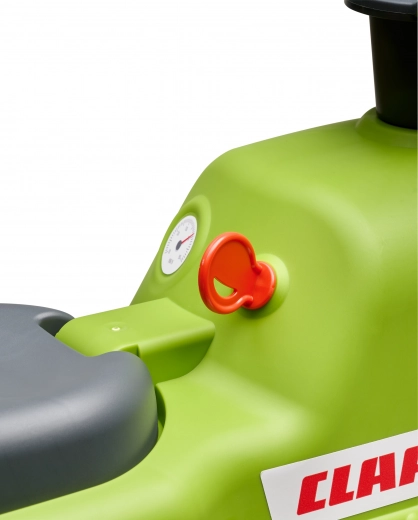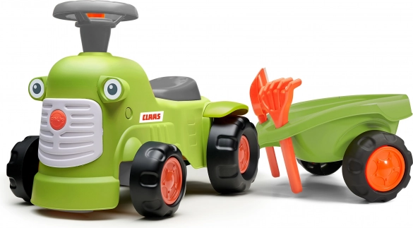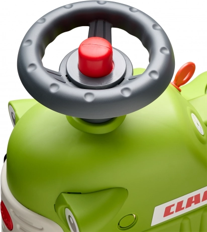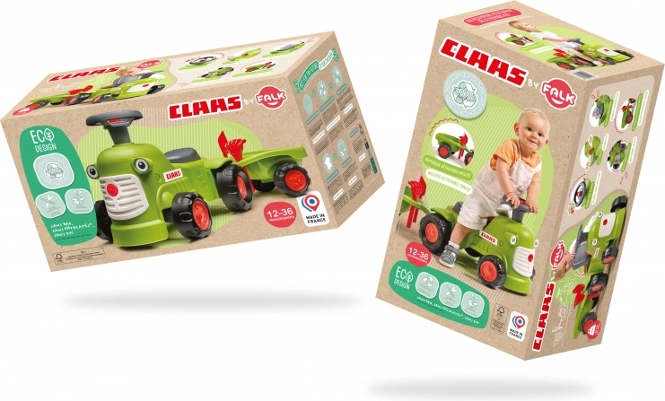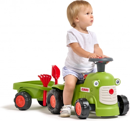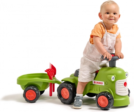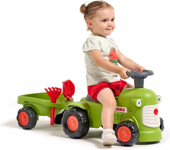 Børne-skubbelegetøj i stil med en CLAAS-traktor vil glæde små chauffører med et ergonomisk sæde med ryglæn, en funktionel rat med horn og en trailer med rive og skovl. Fremstillet i Frankrig af kvalitets-, højst holdbar plast med 50 % genanvendte materialer, testet efter europæiske standarder op til 30 kg.