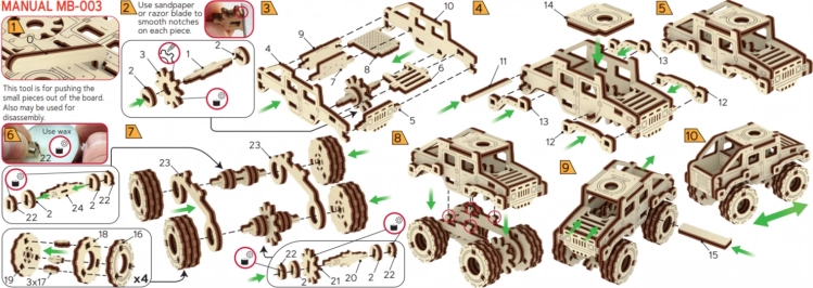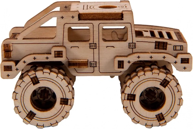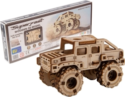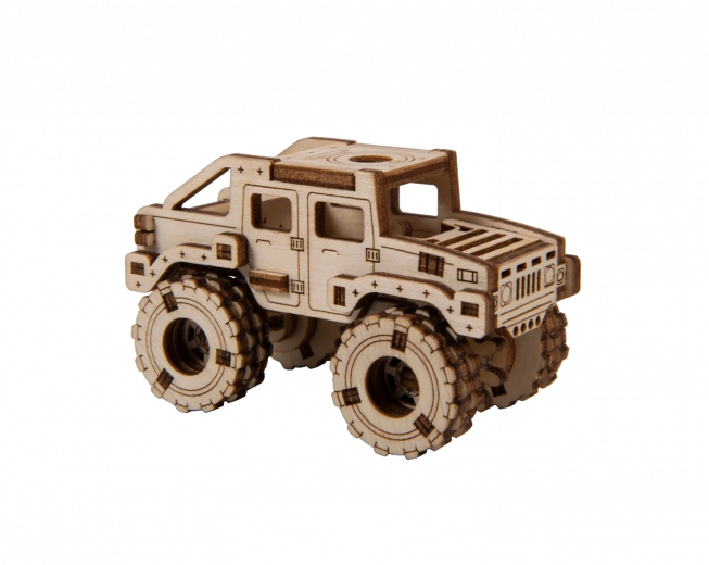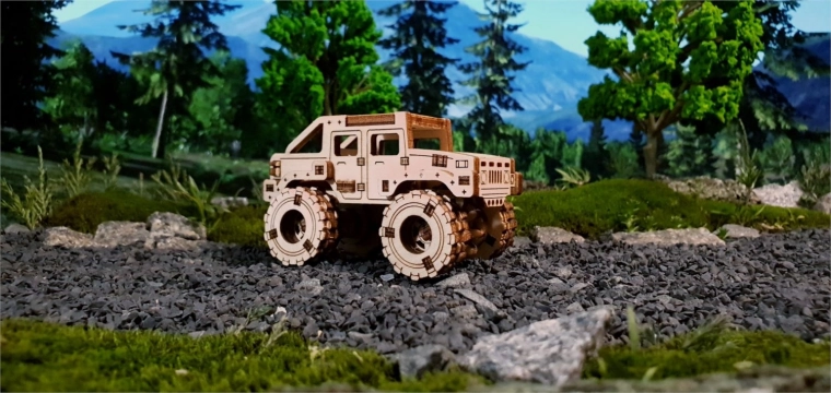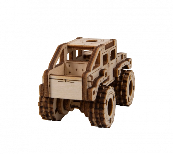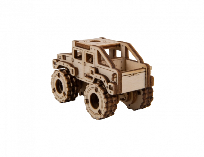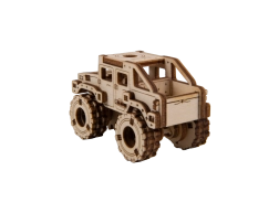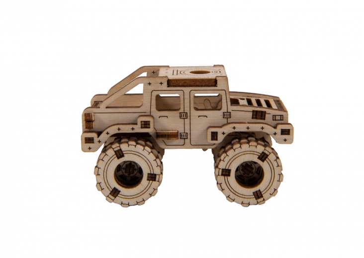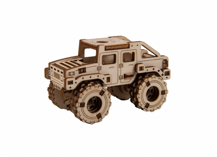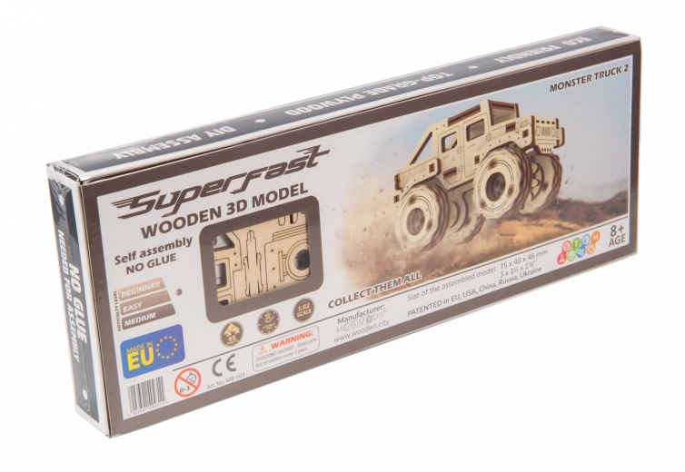 Produktet af økologiske materialer respekterer bæredygtighed – uden plastemballage. Den færdige model kan du desuden male efter din fantasi, så den passer til din indretning eller samling. Perfekt til fans af monstertrucks, børn fra 8 år og voksne modelbyggere.