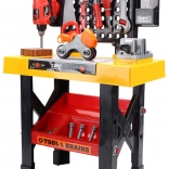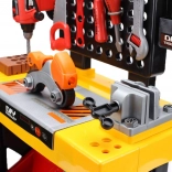 Boremaskine, sav, hammer, skruetrækkere, nøgler, skruer, møtrikker og forbindelsesstykker – alt hvad børn behøver til kreativ byggeri og rolleleg.