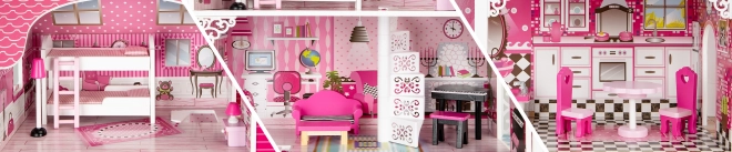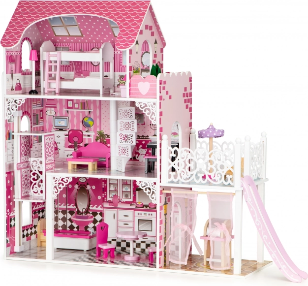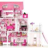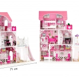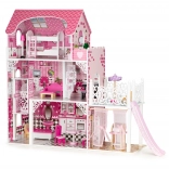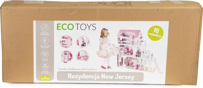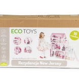 ECOTOYS dukkehus er et perfekt sted for alle små entusiaster af fantasifuld leg. Det tilbyder 3 uafhængige niveauer og i alt 7 værelser, der perfekt efterligner et rigtigt boligområde. Hvert rum er færdiggjort i en anden stil, hvilket tillader børn at lege indretningsdesignere og arrangere møbler efter deres egen fantasi.