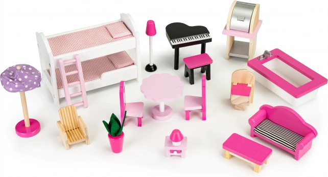 Pakken inkluderer også et sæt med 16 møbler, der omfatter en seng, klaver, sofa og mange flere detaljerede elementer, som giver børn mulighed for kreativ rolleleg og udvikling af manuelle færdigheder.