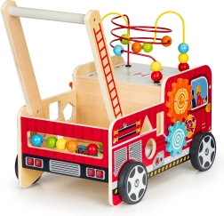 Det træformede brandbil-walker er en ideel hjælper til dit barns første skridt. Walker er designet til at give stabilitet og samtidig sjov gennem forskellige interaktive elementer som tandhjul, perlelabyrinter og formsortering.
