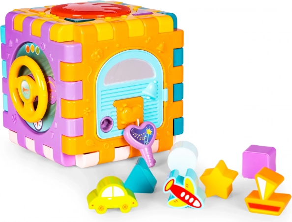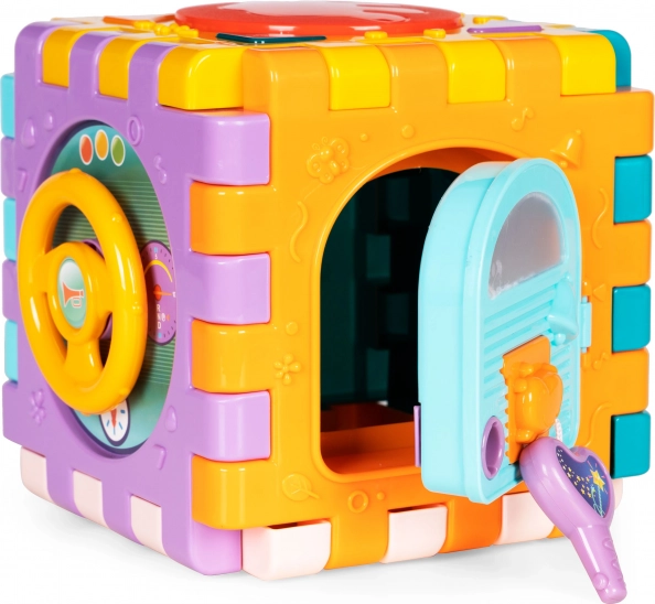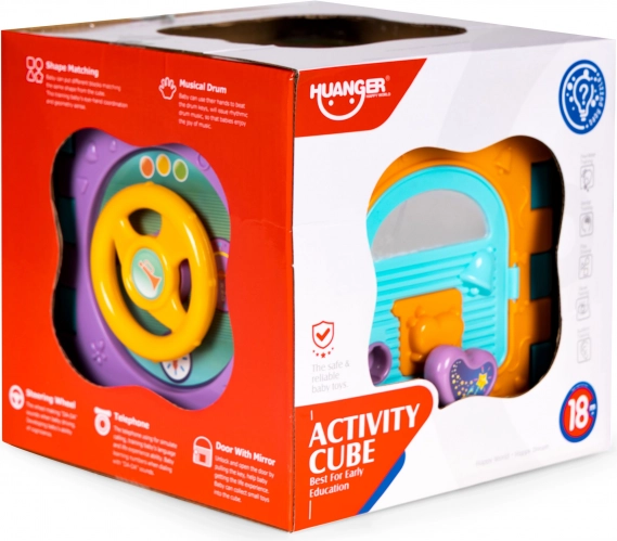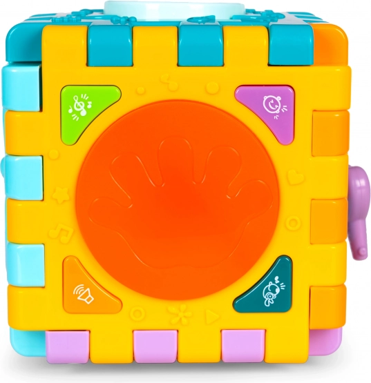 En af terningens sider har knapper med glade melodier og lyde. Når du trykker, lyser midten af terningen op i forskellige farver i takt med melodierne.