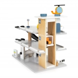 Denne fleretagers trægarage giver børn en ægte actionzone: bilerne suser ned ad ramperne mellem etagerne, stopper ved færdselsskilte, og takket være den bevægelige elevator flyttes de let op og ned. På taget er der en heliport, hvor den medfølgende helikopter kan lande.