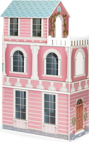 Vi præsenterer det store dukkehus fra ECOTOYS, som er en perfekt afspejling af et ægte hjem. Huset har 3 separate etager og 5 rummelige værelser, inklusive en øverste terrasse, hvilket giver mulighed for fri leg med små og store dukker. Børnene kan nyde at arrangere og omstille møbler efter deres fantasi.