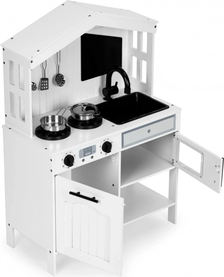 Køkkenet er udstyret med drejeknapper til at simulere temperaturregulering og indstilling af kogeplader, hvilket muliggør kreativ og sikker leg.