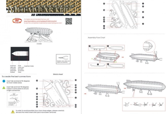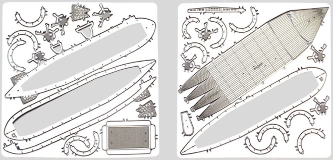 Æsken indeholder to stålplader med stykker skåret ud med lasergravering og vejledning til samling. Værktøjer er ikke inkluderet. For at samle stykkerne har du brug for en lille bidetang og tynde tænger. Anbefalet til modelbyggere fra 14 år.