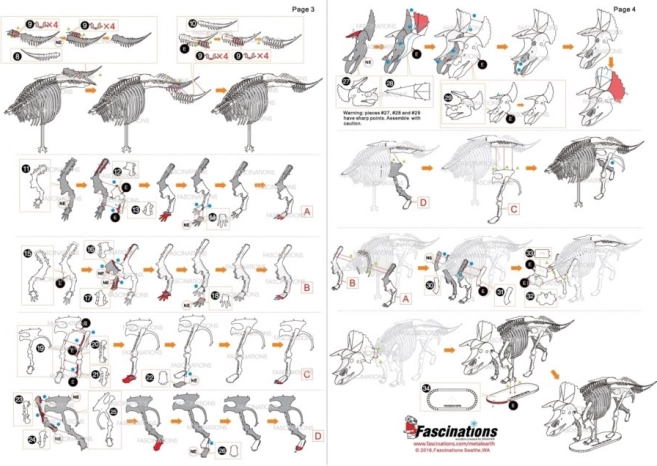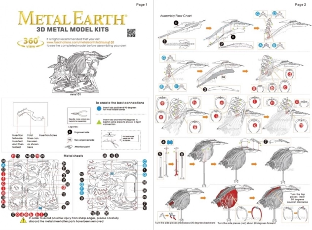 Fjern de enkelte dele fra metalpladerne; brug om nødvendigt en lille sidetangsaks (medfølger ikke). Delene samles ved hjælp af låse bestående af en tap og et hul. Bøj tappen med en lille spidstang (medfølger ikke), og saml gradvist alle låse, indtil du har et meget realistisk mesterværk!