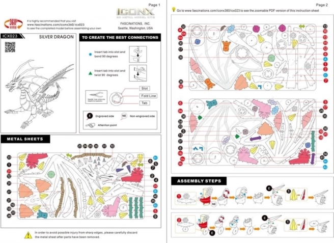 Fjern de enkelte dele fra metalpladerne; brug om nødvendigt en lille bidetang (medfølger ikke). Delene forbindes med låse bestående af en tap (krog) og et hul. Bøj tappen med en lille spidstang (medfølger ikke), og forbind gradvist alle låsene, indtil der opstår et meget realistisk mesterstykke!