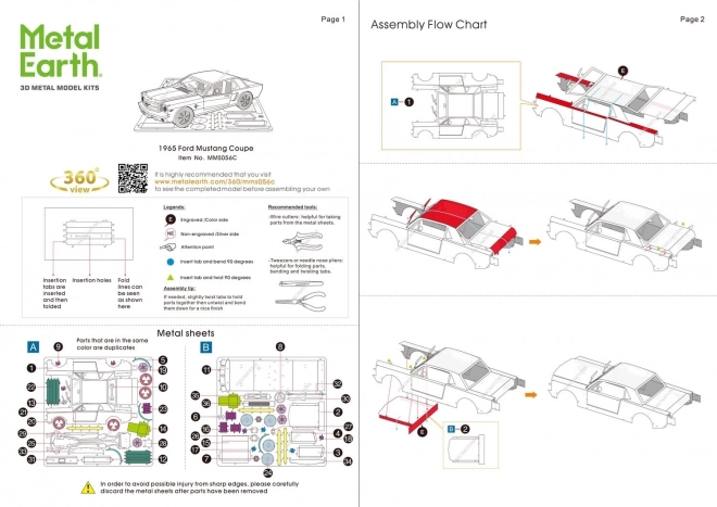 En spændende udfordring, byggeglæde og et strålende resultat – sådan er METAL EARTH-modeller! Model af samlerbilen Ford Mustang 1965 for alle elskere af klassiske veteranbiler. At bygge 3D-puslespillet METAL EARTH kræver tålmodighed og dygtige hænder. Resultatet opvejer dog fuldt ud den nedlagte indsats! De miniature replikaer er en særlig iøjnefaldende og fængende dekoration ikke kun derhjemme, men også på kontoret eller i skolen. Af kvadratiske stålplader (11 x 11 cm) vokser der under dine hænder en detaljeret, fascinerende model frem. Den autentiske fremtoning af METAL EARTH 3D-puslespil opnås takket være detaljeret lasergravering. Pakken indeholder 2 stålplader og en monteringsvejledning. Værktøj er ikke inkluderet. ARBEJDSFREMGANGSMÅDE: Fjern de enkelte dele fra metalpladerne; brug om nødvendigt små skævbider/tænger (ikke inkluderet). Delene samles ved hjælp af låse bestående af en tap (krog) og et hul. Bøj tappen med små, tynde fladtænger (ikke inkluderet), og forbind gradvist alle låse, indtil der opstår et meget realistisk mesterstykke! Anbefalet alder: fra 14 år. Mål på det samlede puslespil ca. 8,5 x 4,2 x 4,5 cm