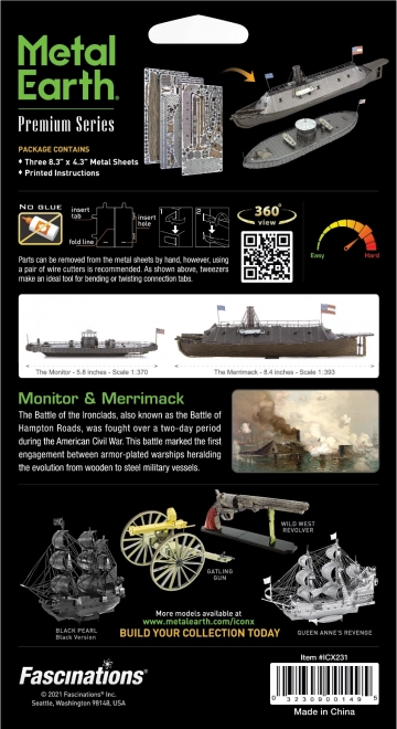 Oplev ikoniske skibe fra den Amerikanske Borgerkrig som detaljerede metalmodeller: USS Monitor og CSS Virginia (Merrimack). Dette premium 3D-metalbyggesæt METAL EARTH ICONX benytter rustfri plader med farvet tryk og fin lasergravering, som troværdigt gengiver panser, tårne og dæksdetaljer.